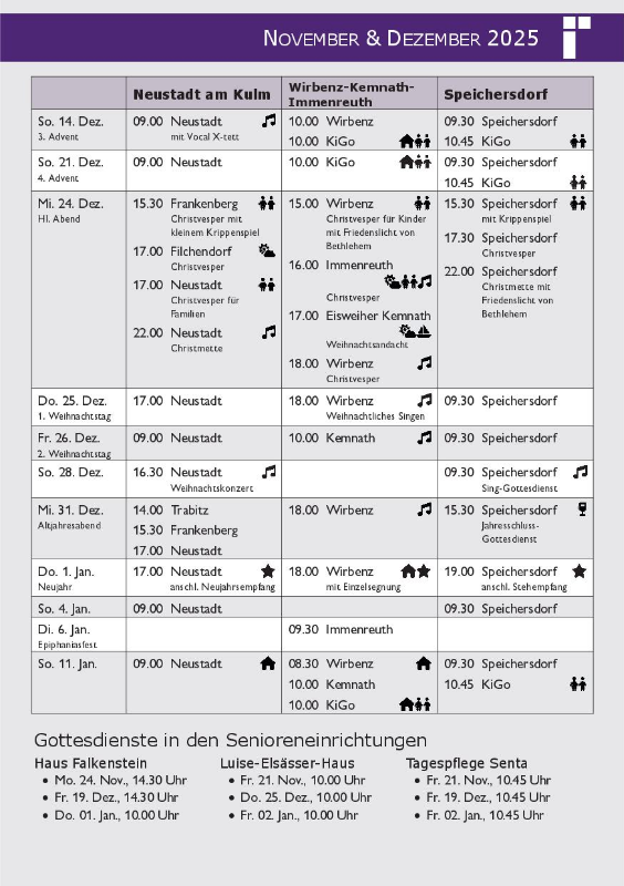 - Fr, 26.12., 10:00 Uhr: Gottesdienst in der Friedenskirche in Kemnath