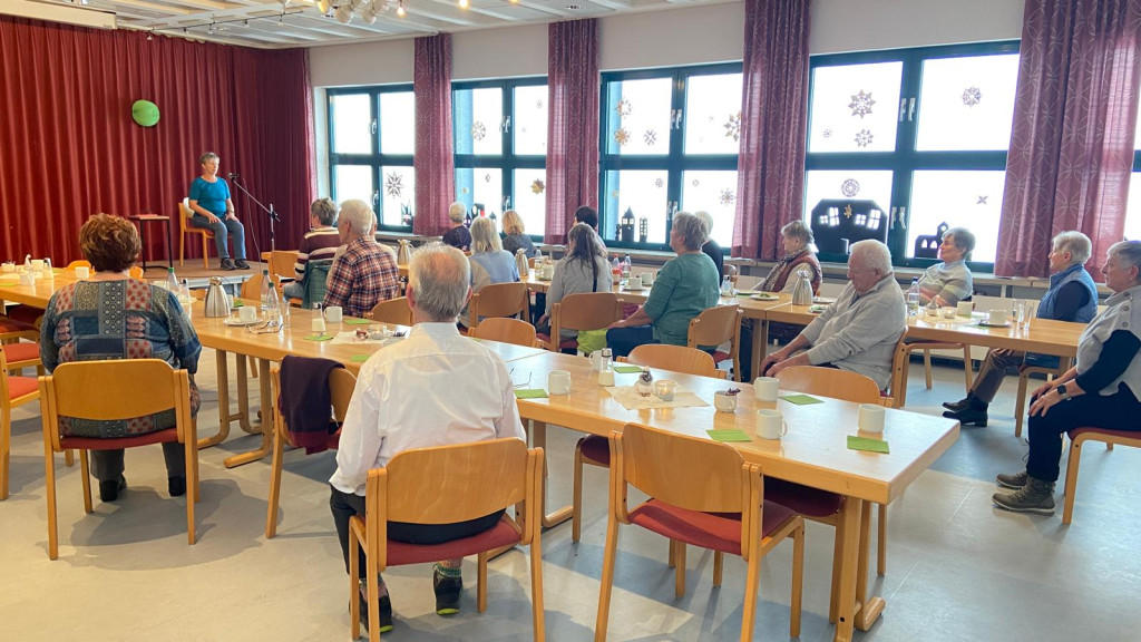 Pfarrerin Friederike Steiner eröffnete das Cafe miteinander mit einer Kurzgeschichte von Elke Bräunling. Ein altes Ehepaar macht seinen geliebten Garten winterfest, dabei kommt ein unter einem Rosmarinstrauch versteckter kleiner Igel zum Vorschein. Um ihm ein behagliches Winterlager zu schaffen, wird das Gartenlaub zu einem großen Blätterberg zusammengefegt und mit Holzscheiten und trockenen Zweigen beschwert. So können wir in unserem Garten Tieren ein Zuhause bieten. Für unser Zuhause können wir auch das eine oder andere tun, um altersgerechtes und damit sicheres Wohnen zu ermöglichen. Mit diesen Worten leitete sie über zu Isolde Guba von der Seniorenfachstelle des Landratsamtes Tirschenreuth. Nach einer kurzen, persönlichen Vorstellung gab die Referentin einen fünfzig- minütigen Überblick über ein komfortables, langfristiges und gutes Wohnen in den eigenen Räumen. Dabei sprach sie vor allem die kritischen Bereiche Eingang, Treppen und Badezimmer an. Anpassungen lohnen sich zu jeder Zeit und nicht erst, wenn der Kranken-hausaufenthalt oder die Reha sich dem Ende nähern. Leider musste sie auch darauf hin- weisen, dass der Bayrische Staat die Förderung für Umbauten eingestellt hat. Bei einem Pflegegrad übernimmt die Kasse 4.180,00 €. Was ohne finanzielle Mittel geht, ist die Reduzierung von längst nicht mehr benötigten Haushaltswaren. Die Musterwohnung in Tirschenreuth steht für jede und jeden offen. In 2026 gibt es vier Tage der offenen Musterwohnung. Mit einem riesigem Applaus und einem kleinen Präsent wurde Frau Guba verabschiedet. Brigitte Strößner beschloss den informativen Nachmittag mit einem irischen Segen und lud zum nächsten Cafe miteinander am 02.12.25 ein.
