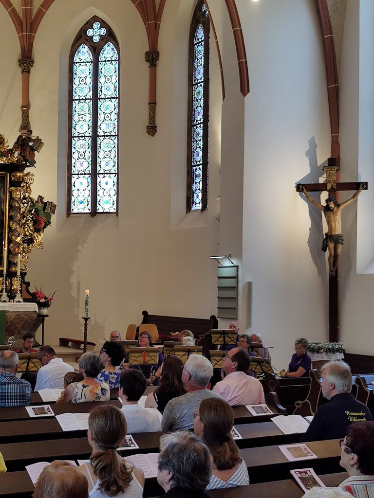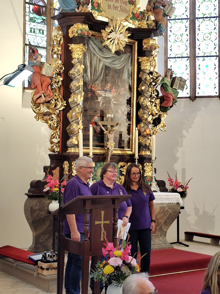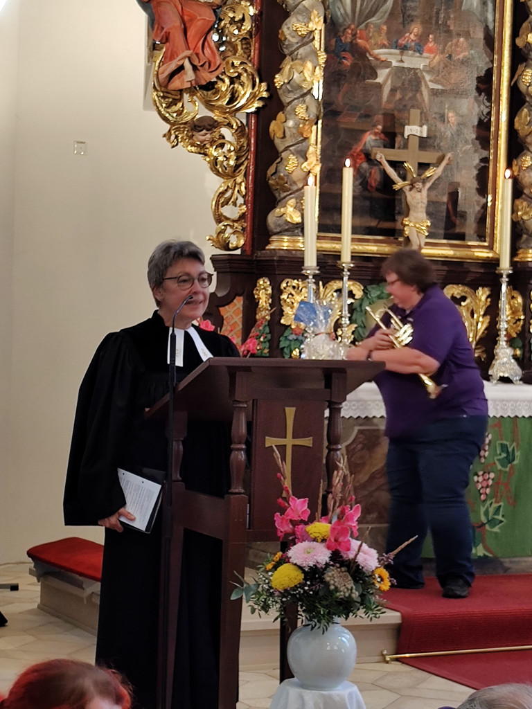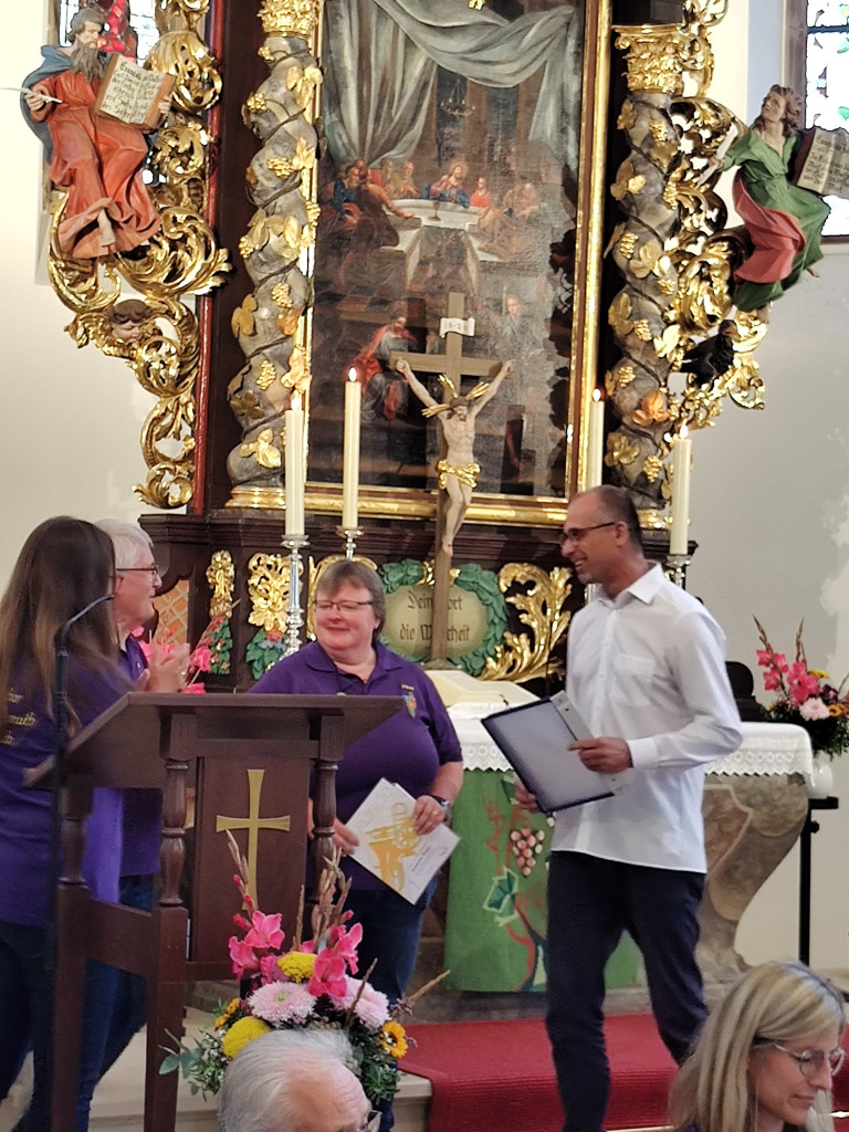 Ab 10 Uhr eröffneten wir den Festgottesdienst mit unserer Jubiläumsmusik, die LLPW KMD Dieter Wendel extra für uns komponiert hat. Besonders hat uns gefreut, dass er bereit war, in zwei Sonderproben mit uns die Jubiläumsmusik einzustudieren und heute auch die Chorleitung zu übernehmen. Der Festgottesdienst feierten mit uns die Pfarrerinnen Friederike Steiner und Kathrin Spies, sowie Pfr. Hartmut Klausfelder. An der Orgel unterstütze uns Gertraud Burkhardt mit wunderbarem Spiel. So konnten wir auch mal durchschnaufen.