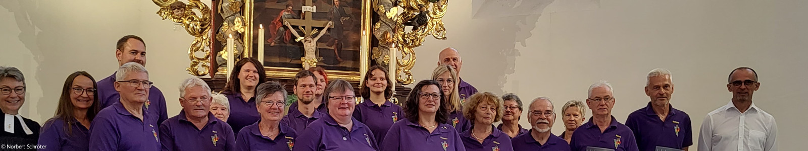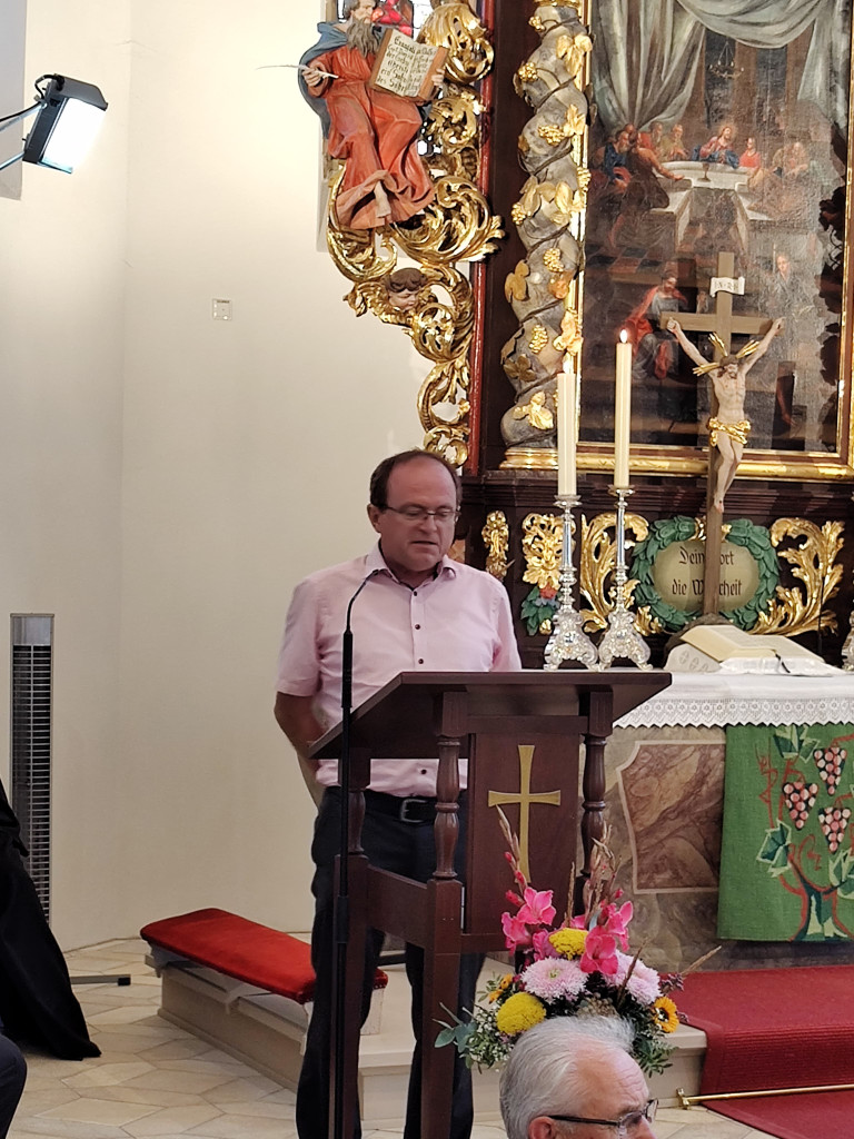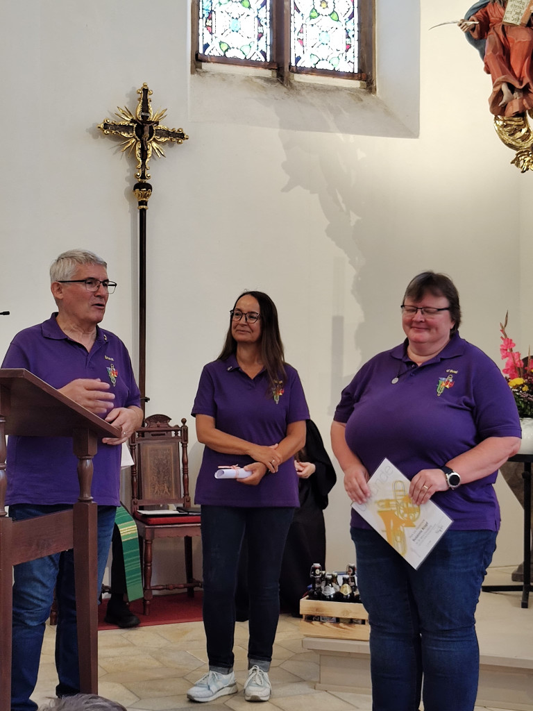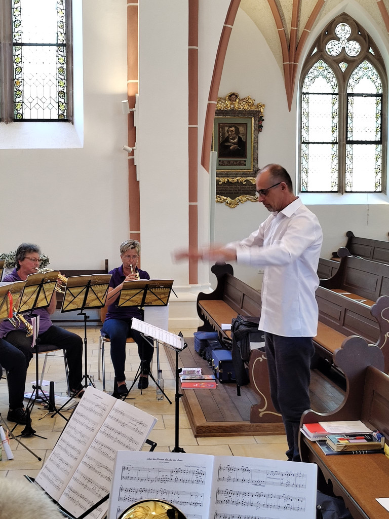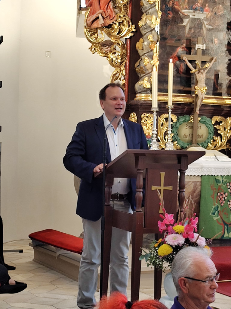 Ab 10 Uhr eröffneten wir den Festgottesdienst mit unserer Jubiläumsmusik, die LLPW KMD Dieter Wendel extra für uns komponiert hat. Besonders hat uns gefreut, dass er bereit war, in zwei Sonderproben mit uns die Jubiläumsmusik einzustudieren und heute auch die Chorleitung zu übernehmen. Der Festgottesdienst feierten mit uns die Pfarrerinnen Friederike Steiner und Kathrin Spies, sowie Pfr. Hartmut Klausfelder. An der Orgel unterstütze uns Gertraud Burkhardt mit wunderbarem Spiel. So konnten wir auch mal durchschnaufen.
