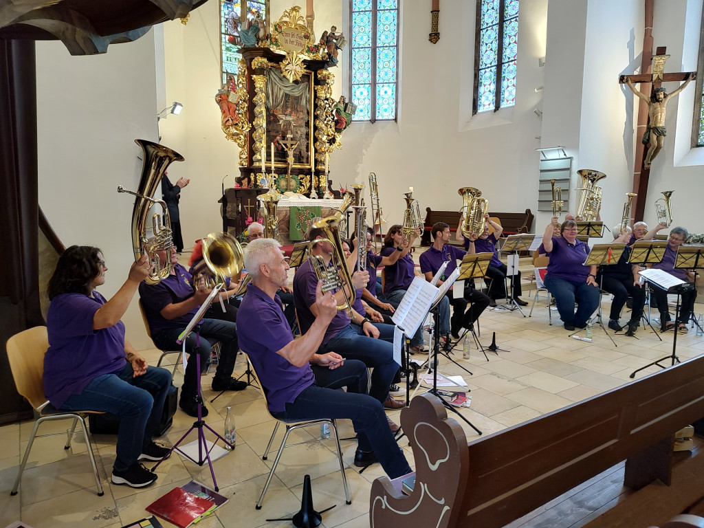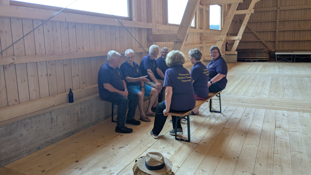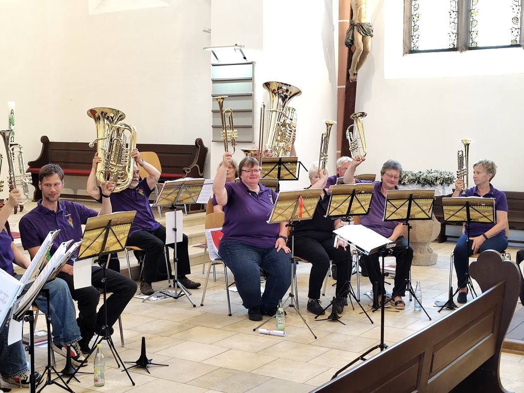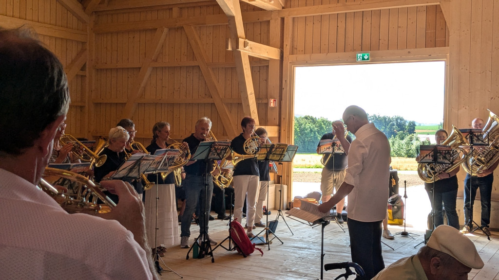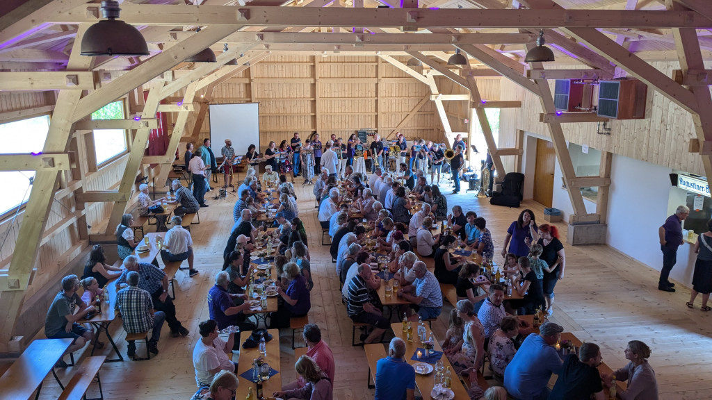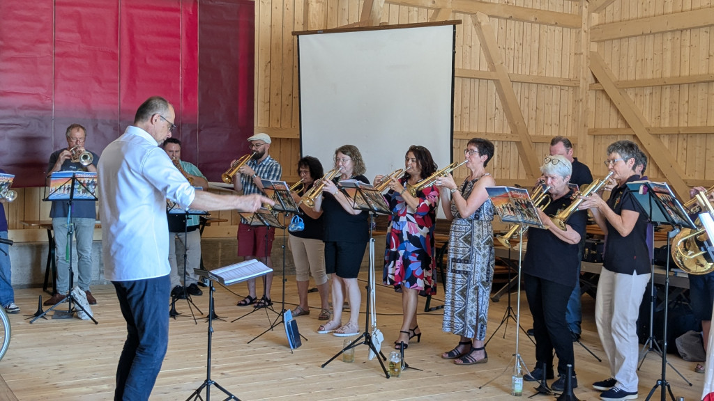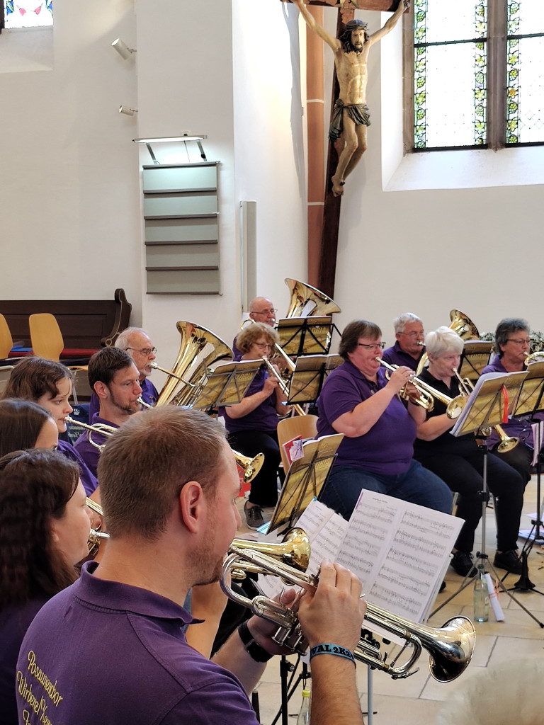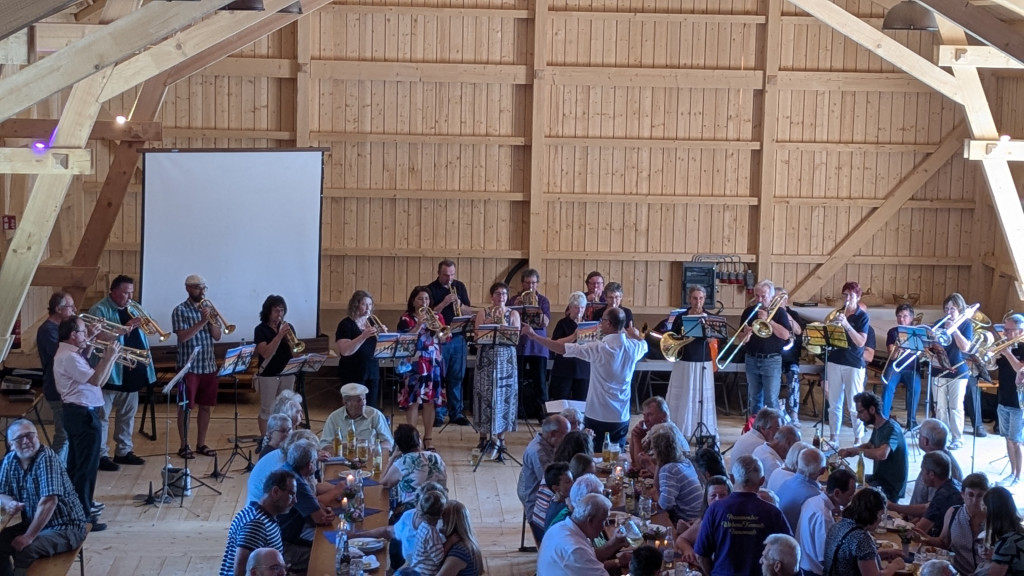 Nach dem Gottesdienst machten wir uns alle auf dem Weg in die nagelneue Kulturscheune von Wirbenz. Während vom Gasthaus Busch das Mittagessen ausgegeben wurde, sammelten sich alle Bläserinnen und Bläser aus nah und fern in der Halle um mit Dieter noch ein wenig Musik zu machen. Dieses freie Blasen ist eine alte Tradition, die ich aus meiner Jungbläserinnenzeit noch kenne. Man besucht Jubiläumschöre und macht gemeinsam Musik. Es war wunderschön. VIELEN DANK ALLEN, die mit uns und für uns musiziert haben.