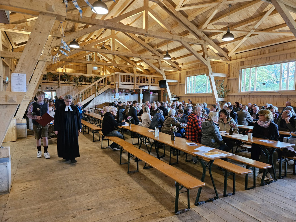 Der „Kombi-Gottesdienst“ Erntedankfest und Kirchweihfest („Kirwa“) wurde am Sonntag in der Kulturscheune Wirbenz gefeiert. Während der Posaunenchor die Fanfare "Offene Herzen" zum Eingang spielte, zogen unsere Pfarrerin mit den Kindergottesdienstkindern und ihrem Team um Frau Nerlich in die Kulturscheune ein. Dabei hatten sie zwei Handwagen, die mit den gespendeten Erntegaben beladen waren. Etwa 200 Gäste feierten in der Kulturscheune, das kurz vorher von der Kirwajugend von den Resten des Kirwatanzes am Abend vorher befreit worden war.