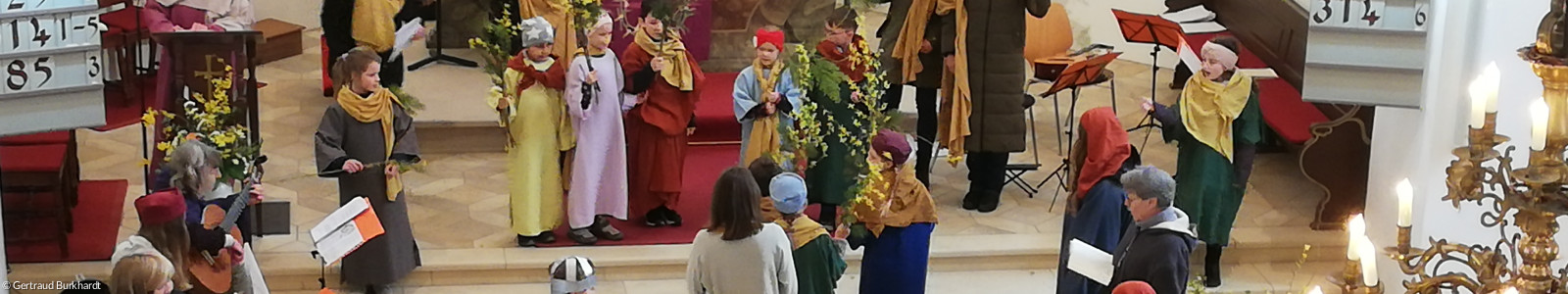Am Palmsonntag, 02.04.2023, gestalteten in der St. Johannis-Kirche die Kinder des Kindergottesdienstes unter der Leitung von Gerlinde Nerlich und ihrem Team einen Familiengottesdienst. Dieser wurde von Lektor Werner Schlöger geleitet. Frau Nerlich begleitete einige Lieder wie „Jesus zog in Jerusalem ein“, „Jesus, höchster Name“ oder „Ich lobe meinen Gott“ mit der Gitarre. Zudem trug ein Gitarrenensemble meditative Stücke bei.