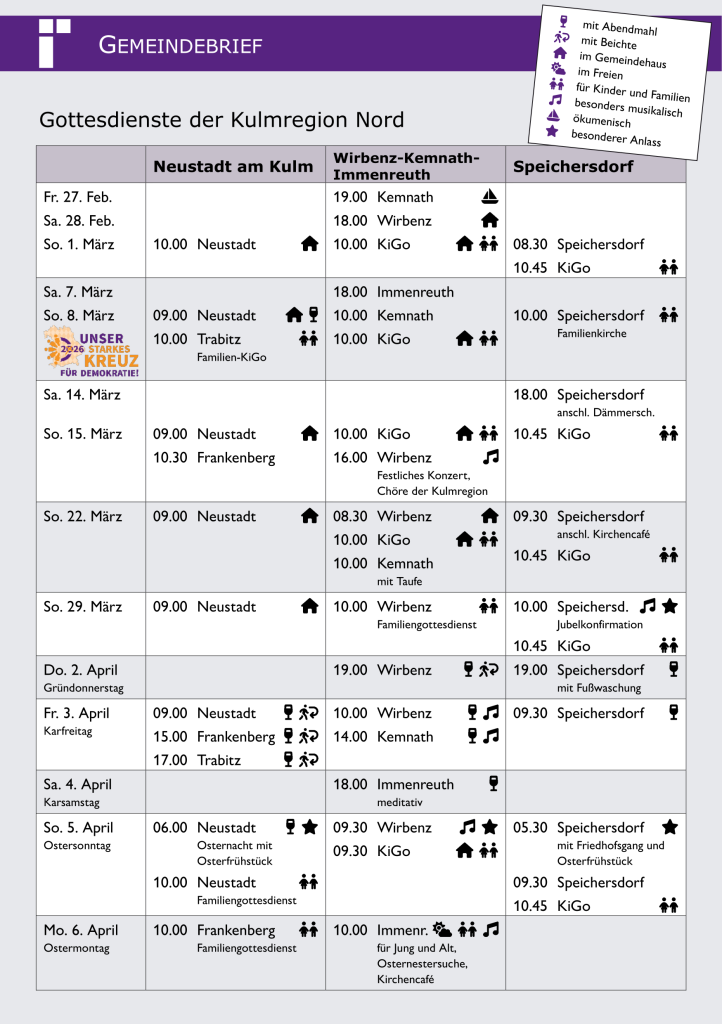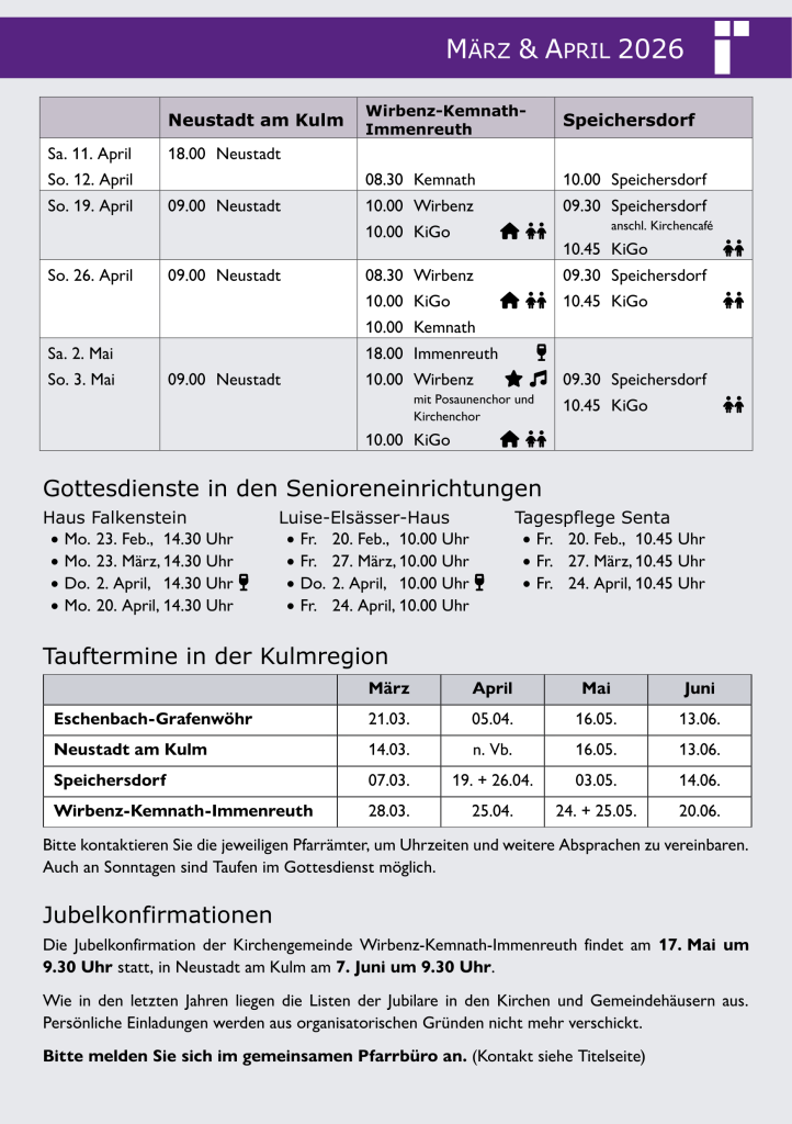 - am Ostersamstag, 04.04.2026 um 18:00 Uhr: Meditativer Gottesdienst m. Abendmahl in Immenreuth