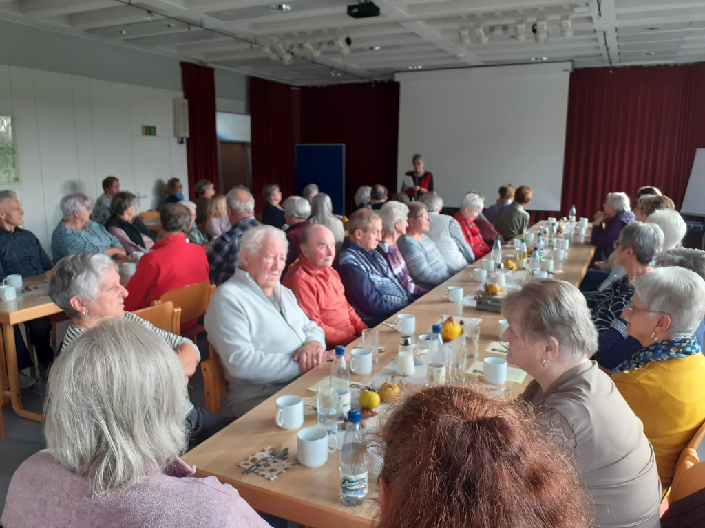 Pfarrerin Friederike Steiner eröffnete das Cafe miteinander mit einer Kurzgeschichte von Elke Bräunling. Ein altes Ehepaar macht seinen geliebten Garten winterfest, dabei kommt ein unter einem Rosmarinstrauch versteckter kleiner Igel zum Vorschein. Um ihm ein behagliches Winterlager zu schaffen, wird das Gartenlaub zu einem großen Blätterberg zusammengefegt und mit Holzscheiten und trockenen Zweigen beschwert. So können wir in unserem Garten Tieren ein Zuhause bieten. Für unser Zuhause können wir auch das eine oder andere tun, um altersgerechtes und damit sicheres Wohnen zu ermöglichen. Mit diesen Worten leitete sie über zu Isolde Guba von der Seniorenfachstelle des Landratsamtes Tirschenreuth. Nach einer kurzen, persönlichen Vorstellung gab die Referentin einen fünfzig- minütigen Überblick über ein komfortables, langfristiges und gutes Wohnen in den eigenen Räumen. Dabei sprach sie vor allem die kritischen Bereiche Eingang, Treppen und Badezimmer an. Anpassungen lohnen sich zu jeder Zeit und nicht erst, wenn der Kranken-hausaufenthalt oder die Reha sich dem Ende nähern. Leider musste sie auch darauf hin- weisen, dass der Bayrische Staat die Förderung für Umbauten eingestellt hat. Bei einem Pflegegrad übernimmt die Kasse 4.180,00 €. Was ohne finanzielle Mittel geht, ist die Reduzierung von längst nicht mehr benötigten Haushaltswaren. Die Musterwohnung in Tirschenreuth steht für jede und jeden offen. In 2026 gibt es vier Tage der offenen Musterwohnung. Mit einem riesigem Applaus und einem kleinen Präsent wurde Frau Guba verabschiedet. Brigitte Strößner beschloss den informativen Nachmittag mit einem irischen Segen und lud zum nächsten Cafe miteinander am 02.12.25 ein.