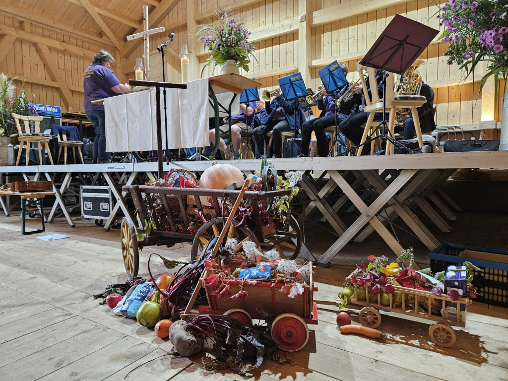 Der „Kombi-Gottesdienst“ Erntedankfest und Kirchweihfest („Kirwa“) wurde am Sonntag in der Kulturscheune Wirbenz gefeiert. Während der Posaunenchor die Fanfare "Offene Herzen" zum Eingang spielte, zogen unsere Pfarrerin mit den Kindergottesdienstkindern und ihrem Team um Frau Nerlich in die Kulturscheune ein. Dabei hatten sie zwei Handwagen, die mit den gespendeten Erntegaben beladen waren. Etwa 200 Gäste feierten in der Kulturscheune, das kurz vorher von der Kirwajugend von den Resten des Kirwatanzes am Abend vorher befreit worden war.