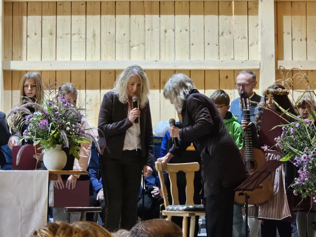 Mit einem Dialog zwischen Marianne Schneider (sie spielte die gestresste Frau) und mit Gerlinde Nerlich wurde das Thema "Mehr Zeit sich nehmen für die schönen Dinge der Erde" diskutiert. Die Kinder zeigt dies mit Bildern und dem Lied "Du hast uns deine Welt geschenkt". Begleitet wurden Sie von Gerlinde Nerlich an der Gitarre und Marianne Schneider unterstützte die Kinder mit ihrem Gesang.